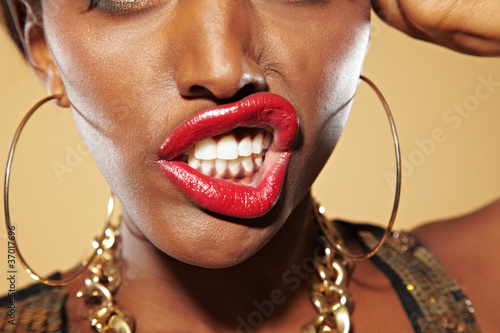 Closeup of beautiful Indian woman with red lipstick and glowing skin
