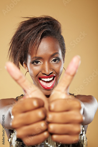 Joyful Brazilian woman with pixie cut laughing on turquoise background