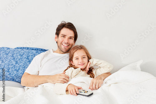 Vater und Tochter im Schlafanzug kuscheln im Bett