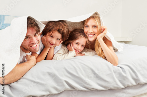 Glückliche Familie mit zwei Kindern liegt im Bett