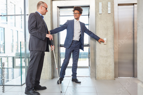Geschäftsmann hilft blindem Mann im Fahrstuhl