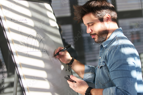 Graphic designer makes sketch on flipchart