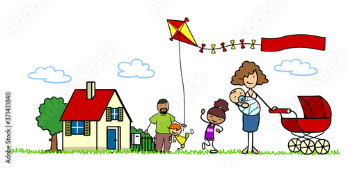 Multikulturelle Familie mit Baby vor Haus beim Spielen