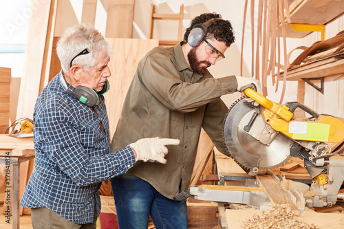 Ausbilder lehrt Schreiner Lehrlinge in der Tischlerei