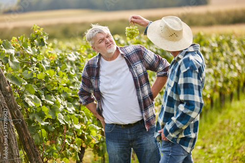 Zwei Winzer betrachten eine Rebe Weintrauben