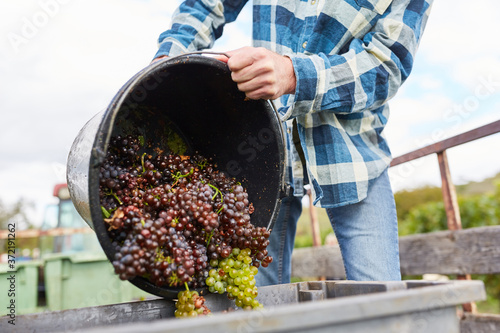 Erntehelfer schüttet Weintrauben in Erntekiste