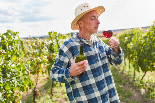 Weinbauer mit einem Glas Rotwein im Weinberg