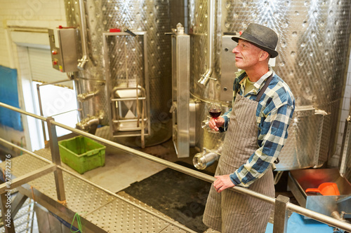 Weinmeister trinkt ein Glas Rotwein vor Gärtank