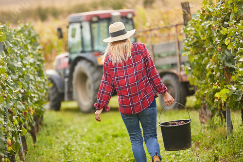 Frau als Erntehelfer bei Traubenlese im Weinberg