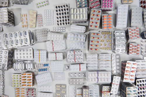 Viele sortierte Medikamente Pillen Tabletten von oben