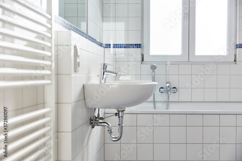 Wash basin with faucet in bright white bathroom
