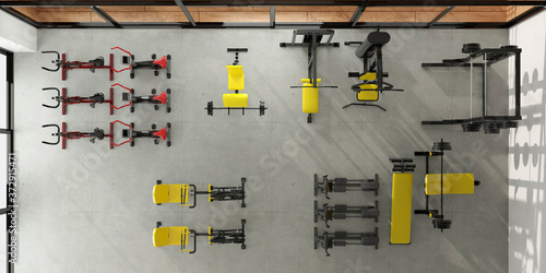 Leeres Fitnesscenter von oben mit vielen Sportgeräten