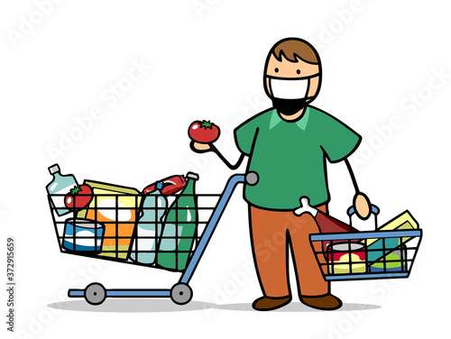 Mann mit Mundschutz und Einkaufswagen beim Einkaufen