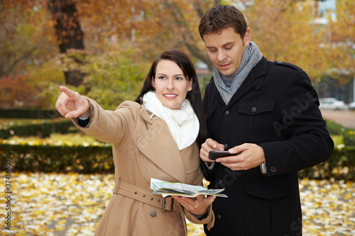 Happy couple reading city map