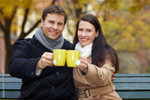 Paar trinkt Tee im Herbst