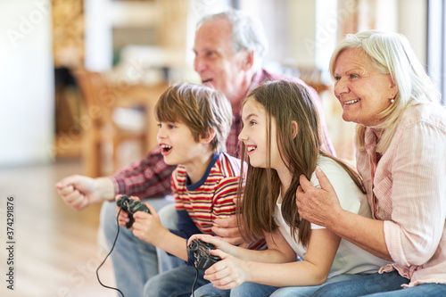 Großeltern und Kinder haben Spaß beim Videospiel