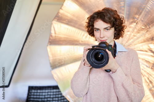 Photographer takes portrait photo in photo studio