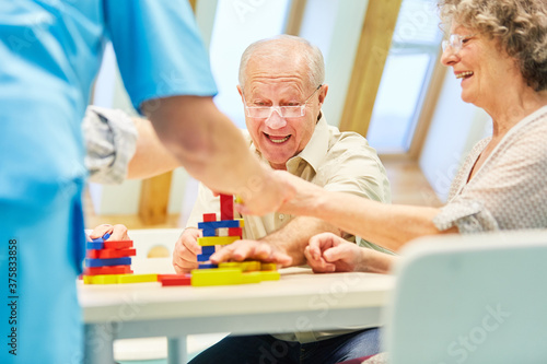 Senioren Gruppe mit Demenz stapelt Bausteine