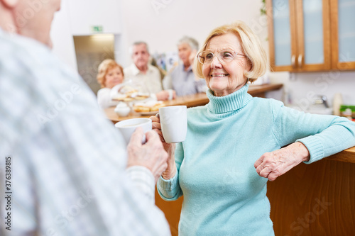 Senioren machen Smalltalk bei einer Tasse Kaffee im Aufenthaltsraum im Altersheim