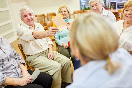 Therapeutin und Senioren machen Denkspiel mit bunten Zetteln als Gedächtnistraining