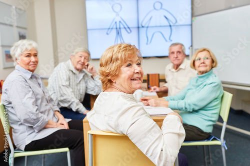 Lächelnde Seniorin in der Erwachsenenbildung in einem Seminar der Volkshochschule