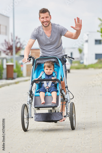 Vater transportiert Kind in Kinderwagen Fahrrad