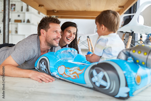 Lachende Eltern spielen mit Sohn im Kinderauto