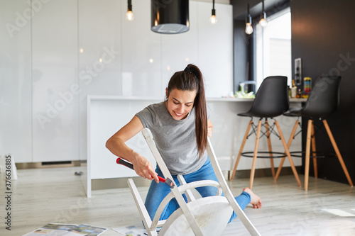 Handyman woman painting chair at home