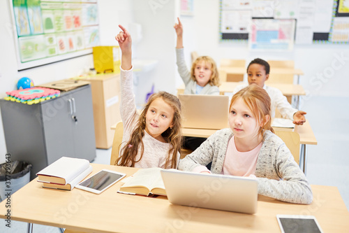 Mädchen in Schule steht vor Tafel mit Muskeln
