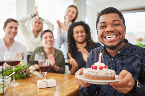 Afrikanischer Mann hält Kuchen mit Kerze am Geburtstag