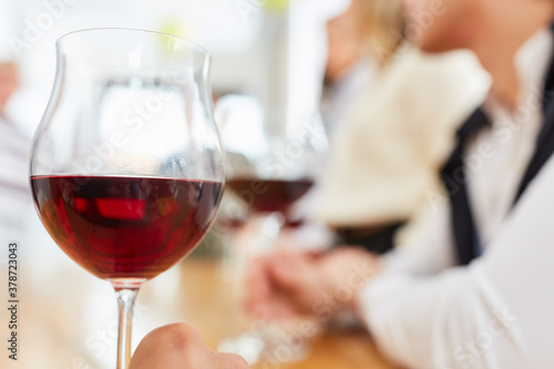 Glas Rotwein im Restaurant vor Gruppe Freunde beim Essen