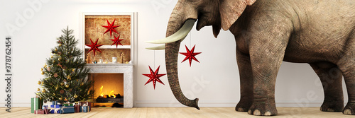 Weihnachten feiern mit Elefant neben Weihnachtsbaum