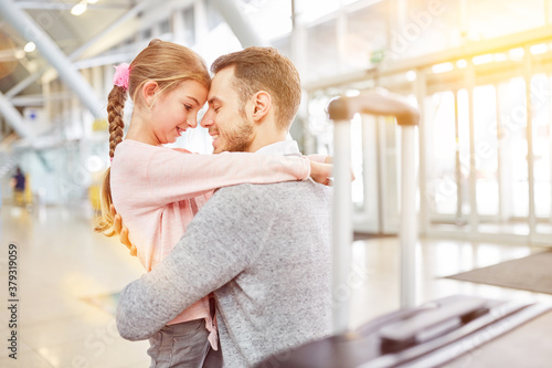 Mädchen umarmt ihren Vater im Flughafen Terminal