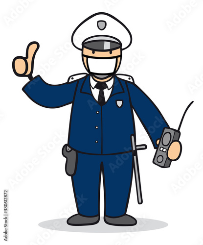 Polizist von der Polizei mit Mundschutz kontrolliert Maskenpflicht