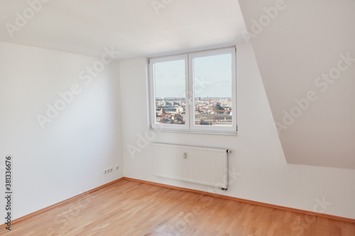 Leerer Raum in Dachgeschosswohnung mit Fenster und Heizung