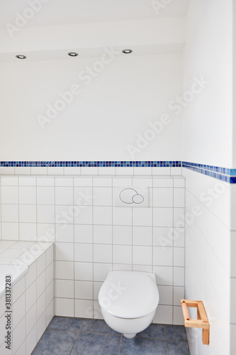 Saubere WC Toilette im Bad neben Badewanne mit weißen Fliesen