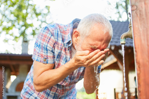 Senior wäscht sein Gesicht an Wasserzapfstelle