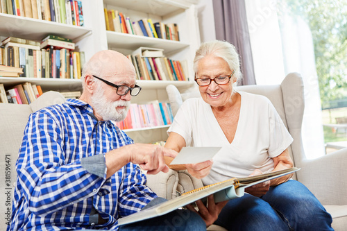 Glückliches Paar Senioren schaut gemeinsam Fotos