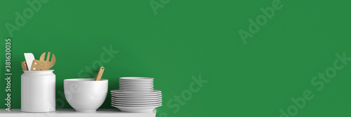 Weißes Geschirr in Küche vor Wand mit Textfreiraum