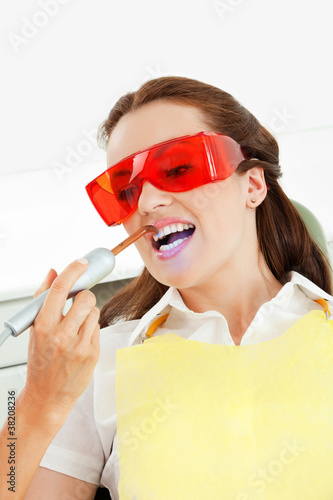 Female patient with protective glasses for laser therapy