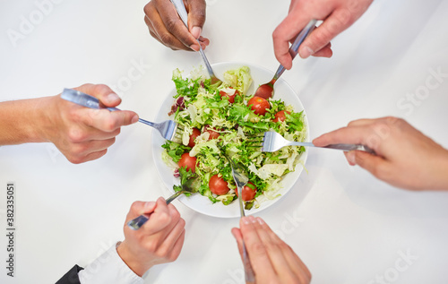 Freunde genießen gemeinsame Pasta Mahlzeit von oben