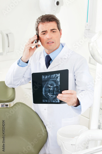 Zahnarzt telefoniert mit Röntgenbild in der Hand