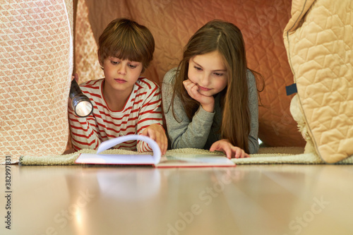 Zwei Kinder lesen Märchenbuch oder Kinderbuch