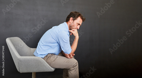 Business Mann sitzt nachdenklich auf einem Stuhl