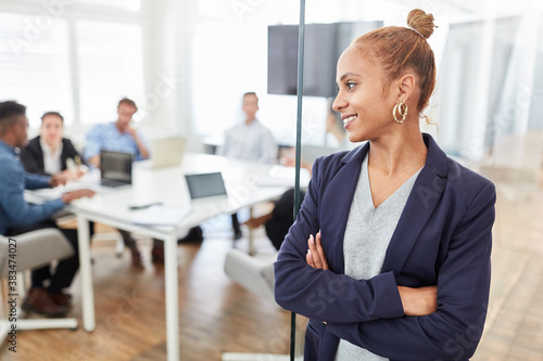 Erfolgreiche Business Frau vor Start-Up Team