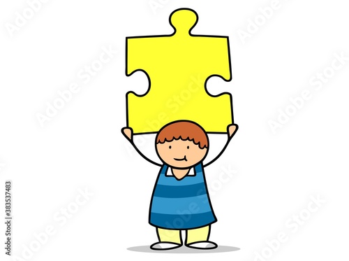 Cartoon Junge hält Teil von einem blauen Puzzle hoch