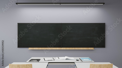 Leeres Klassenzimmer in Schule mit Tafel und Schreibtisch