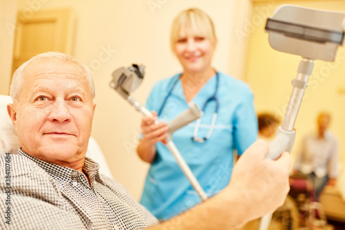 Pflegekraft albert mit einem Senior im Rollstuhl