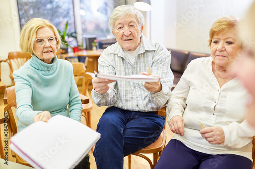 Senioren füllen Fragebogen aus oder schreiben Erinnerungen auf in der Schreibtherapie