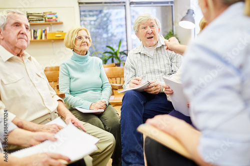 Gruppe Senioren mit Psychotherapeutin in einem Gesprächskreis im Altenheim
